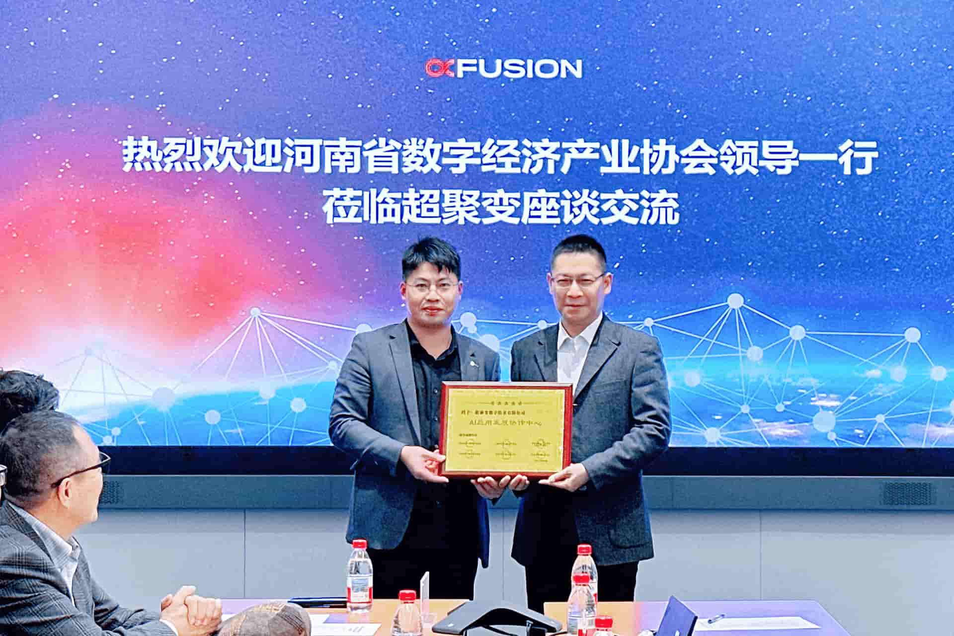 活动现场,河南省数字经济产业协会向超聚变授予“中部六省发展协作中心——AI应用发展协作中心”这一荣誉称号,确立超聚变在中部地区算力资源协同与AI应用落地中的枢纽地位。协会期望依托超聚变的算力底座和AI原生能力,打造一批“AI+场景”示范项目,为中部数字经济注入新动能。