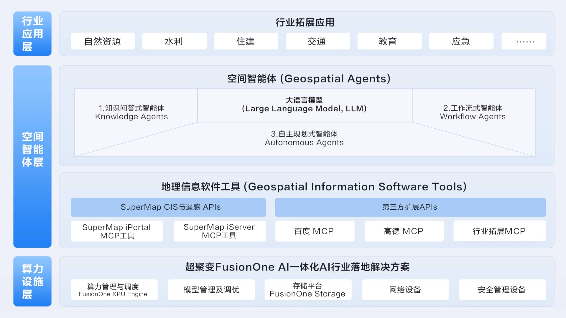 依托超图软件在地理空间AI技术的研究成果,方案构建三大类空间智能体,实现AI与地理信息深度融合: